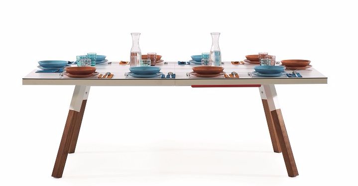 Cette table est aux dimensions d’une table de ping-pong. Des rangements cachent les raquettes et le filet. RS Barcelona, table You and Me.