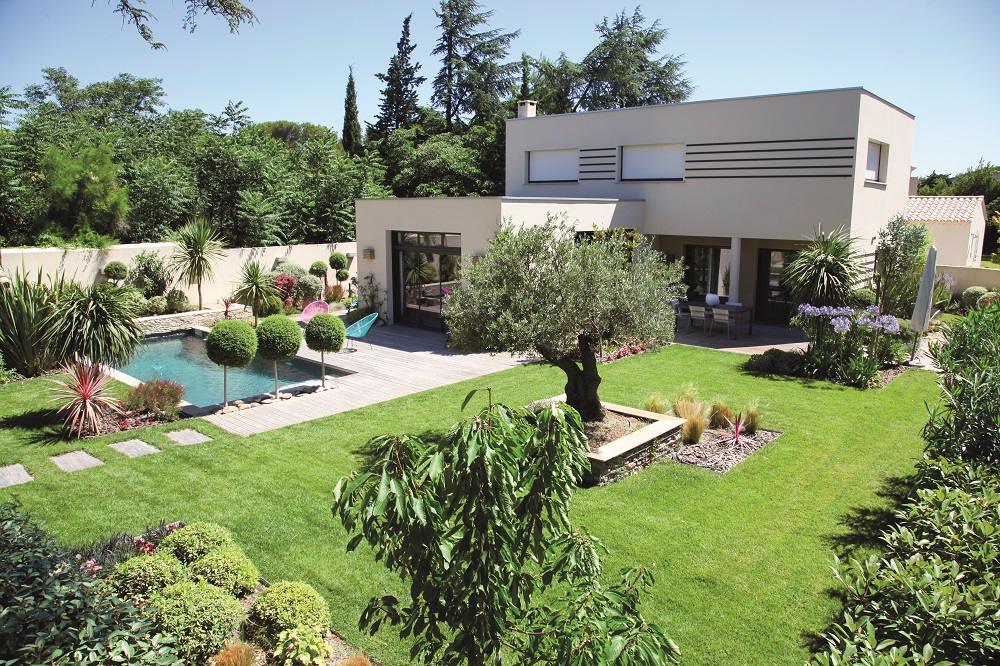 Ce couple de propriétaires, passionné par l’art, le design et le jardin, a fait construire une maison d’architecture très contemporaine sur son terrain, à proximité d’un mazet. Quand ils rencontrent Sylvère Fournier sur un salon, le courant passe immédiatement. Ils reconnaissent dans les réalisations du paysagiste ce qu’ils recherchent, soit un jardin moderne, graphique, mais qui ne perd pas le caractère local dans son atmosphère générale. Ils lui confient donc totalement l’aménagement de leurs 600 mètres carrés, avec deux principales exigences : garder le cèdre déjà présent et planter un olivier dans le décor. Dans les faits, le réel défi pour le paysagiste est de concevoir le jardin comme un espace à vivre qui soit en même temps, et subtilement, un espace de transition. En effet, la circulation sur le terrain est la suivante : on accède à la maison depuis le parking en passant devant la vieille bâtisse, puis devant la piscine. Sylvère Fournier a donc cherché un tracé rectiligne pour ces diverses zones qui puisse refléter le design de la demeure principale, déjà mis en valeur par des tailles en boule et des compositions très graphiques auxquelles répondent, en opposition, des massifs plus touffus et plus colorés. Passionnée de plantes, la propriétaire s’est fortement impliquée dans l’élaboration de cette riche palette végétale aux formes diverses : on y rencontre des phormiums, des pittosporums panachés, des troènes, des camphriers, aux côtés d’une grande variété de vivaces et de graminées. Pour le cheminement autour de ces zones contrastées, Sylvère Fournier a repris les pas japonais depuis l’entrée jusqu’au bassin. Cet espace détente est marqué par un revêtement en ipé, qui se prolonge jusqu’à une terrasse ombragée sur laquelle est placée une table pour le déjeuner. On trouve aussi dans les parties adjacentes à la maison, très végétalisées, un sol en gravier de Durance, afin d’apporter un côté naturel au jardin. Mais en rappel du gris anthracite des baies vitrées design, le paysagiste n’a pas hésité à utiliser l’ardoise en traits graphiques inscrits dans le paysage. Pour valoriser l’olivier souhaité par ses clients, Sylvère Fournier l’a surélevé comme une pièce maîtresse, une oeuvre d’art à admirer, en lui adjoignant un muret de gabion. À l’inverse, le cèdre abrite un petit massif dense, renforçant par contraste une impression de majesté et d’intemporalité.