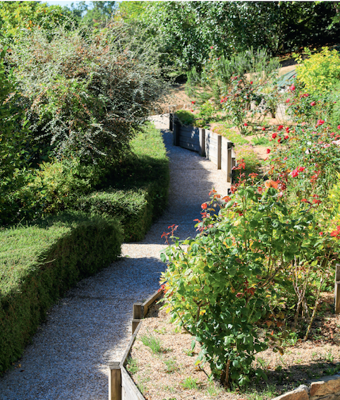 Pour la végétation, les paysagistes ont respecté l’existant, qu’ils ont complété avec des plantations liées au caractère rustique : des rosiers palissés sur les façades, des vivaces, comme les hémérocalles, tout en mixant savamment des bosquets et des ilex taillés en nuage près du bassin pour obtenir un esprit zen. Pour garantir la facilité d’entretien souhaitée par les propriétaires, outre un arrosage calculé des grands espaces, les paysagistes ont misé sur un fil conducteur minéral, notamment dans les circulations. Car avec un relief en forte pente, il a fallu repenser le cheminement, les accès autour de la maison et les allées principales. à l’avant de la demeure, le jardin a été ainsi travaillé en terrasses, avec des soutènements en pierre et en bois qui restent dans cette empreinte campagnarde en pleine ville. Pour des raisons d’esthétisme et d’entretien, les talus ont été végétalisés et minéralisés.