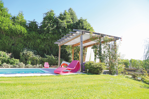 Des pergolas aux abris et au carport, les toits sont plats, et une certaine sobriété préfigure. Le chantier a été réalisé par étapes, sur plusieurs années. Les paysagistes ont commencé par le pourtour de la piscine, en dallage, en y construisant une pergola et une terrasse en bois, à proximité d’un verger. D’un côté du bassin, une zone de massifs joue la carte de la fraîcheur et de la verdure, jusqu’à un abri. De l’autre, un espace engazonné, équipé d’un arrosage automatique, propose une aire de repos ou de jeux ensoleillée. Il fallait agir avec équilibre : cacher les vues sur le jardin mais préserver quelques panoramas. La couleur est donnée par touches par le mobilier.
