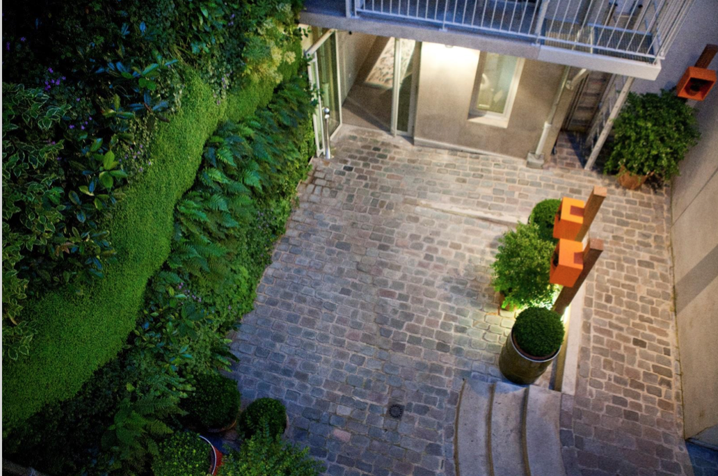 Une fois l’exposition terminée, rien ne vous empêche de faire un détour par le bar de l’hôtel. Ce dernier, lové au cœur du bâtiment est attenant à la cour intérieure. Les hôtes et les visiteurs parisiens s’y confondent à l’abri de l’agitation citadine dans une ambiance intimiste. On s’y donne rendez-vous été comme hiver pour apprécier l’immense mur végétal conçu par les Jardins de Babylone ou la cheminée d’extérieur dans un endroit ouvert mais secret…