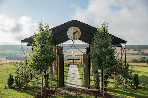 S’il reçoit tous les visiteurs de passage le printemps et l’été, Le Point du Jour est aussi un lieu événementiel : théâtre de verdure, kiosques à musique… qui accueille le spectacle vivant. Et depuis le 29 juin, face à la vallée du Petit Morin se dresse une cathédrale végétale. Un pari étonnant : dédié à toutes les spiritualités, ce lieu respire l’ouverture et la générosité. A terme recouverte de glycine, la structure reprend l’ossature d’une grange, qui protège sans enfermer. Des piliers en chêne posent le dessin d’une nef conduisant à un autel en granit. Le chœur accueille une sculpture de Robert Arboux : l’Envol symbolisera selon les croyances de chacun une foi joyeuse, loin de la figure d’un Christ supplicié, ou une ode à la liberté, à l’imagination, à s’imprégner d’énergie positive. Sur les côtés, un bénitier produit une douce musique, pour peu que l’on caresse son pourtour les mains humides. Les vitraux, conçus par Laurence Weber sur une technique contemporaine, évoquent par le jeu d’un code couleur habilement mené, la genèse de la famille. La magie opère, en osmose avec l’esprit du parc. De cette simplicité émane un sentiment de bien-être ; ici, « l’œil écoute » comme le disait si bien Paul Claudel.
