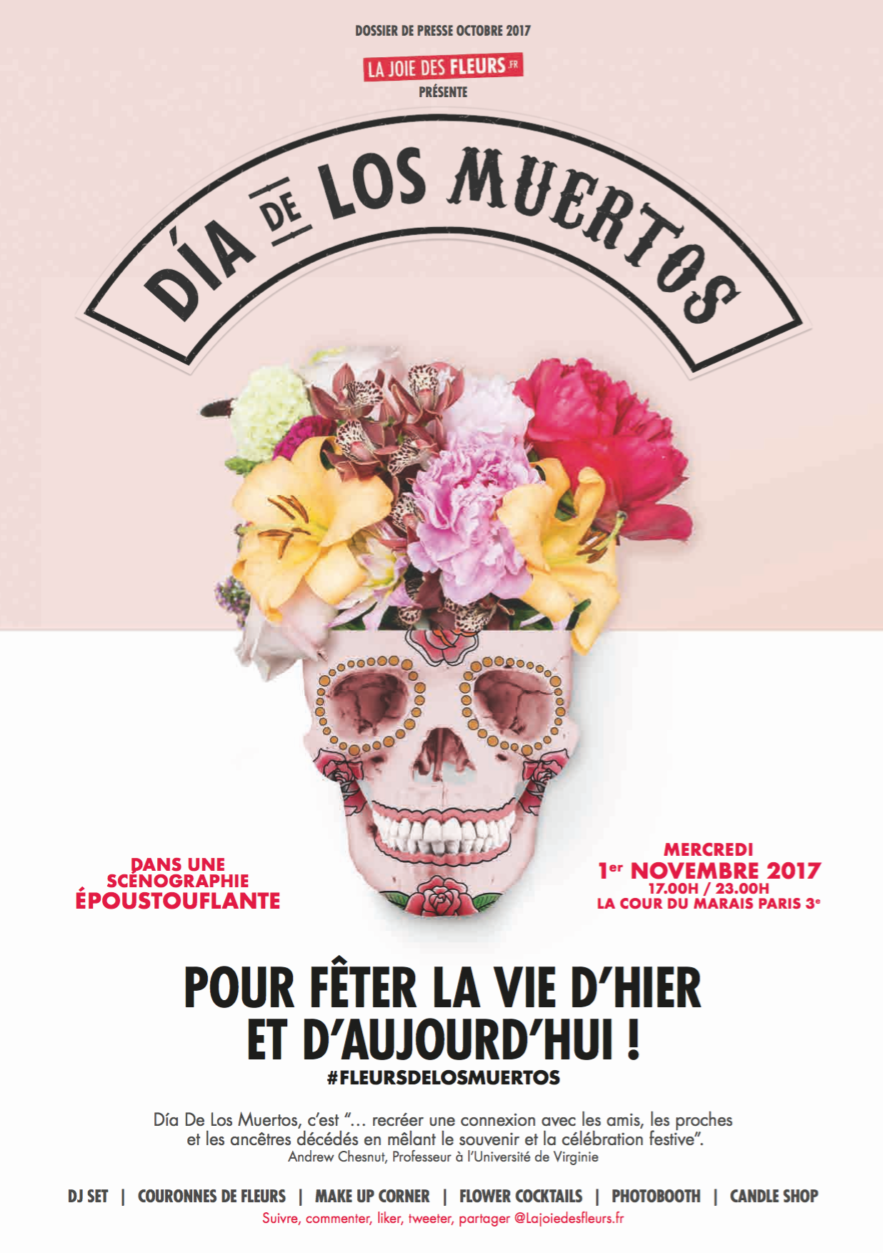 Si différents lieux de concert, comme le Cabaret Sauvage à Paris, commencent à renouveler la fête d’Halloween en l’axant sur l’univers festif du Dia de los Muertos, pour la première fois un événement lui est complètement dédié. À l’initiative de lajoiedesfleurs, une soirée spéciale en entrée libre est organisée dans la cour du Marais, dès 17 h le 1er novembre. Au menu dès 17 h : des installations florales extraordinaires, un candle shop, un workshop couronnes de fleurs, un corner maquillage & PhotoBooth et à partir de 20h un Flower Party et cocktails en Fleurs