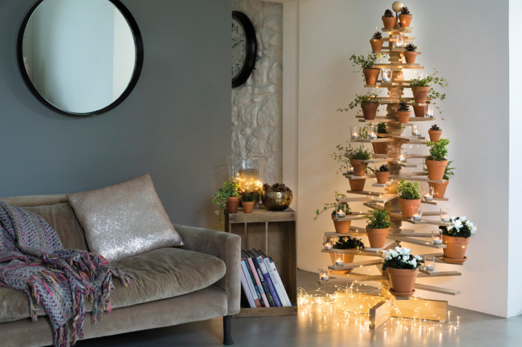 Pour un sapin personnalisé à l’extrême, on recycle ses plantes sur cette structure en bois et en fer au coloris naturel. Botanic, sapin décoratif, 55 €