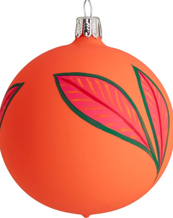 Ornée de feuilles, elle s’invite comme une touche pop dans votre sapin. The Conran Shop, boule à feuilles Maya, 23 €