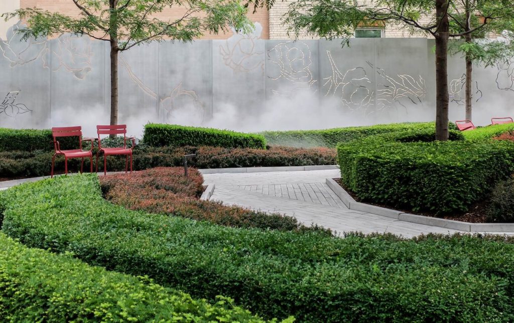 Claude Cormier,  Hôtel Four Seasons, Toronto © Guillaume Paradis CC +A .  Dans la cour intérieure, se confrontent deux parterres : l’un pavé, orné de motif de roses et embelli d’une fontaine rouge rubis en son centre, l’autre planté de massifs sur des plates-bandes, dont la composition prend l’allure d’un puzzle éclaté.