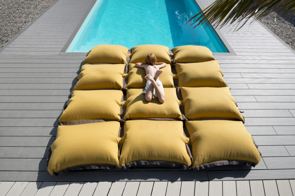 Invitation aux trêves outdoor en solitaire ou en duo, ce pouf XXL réinterprète les codes esthétiques des années pop.