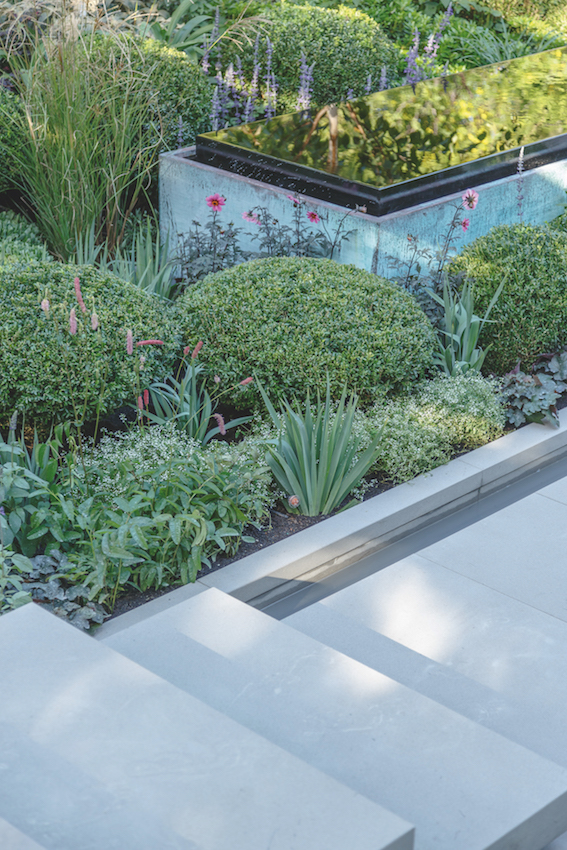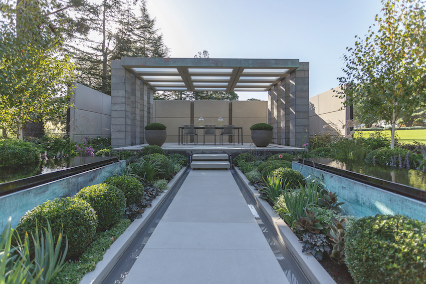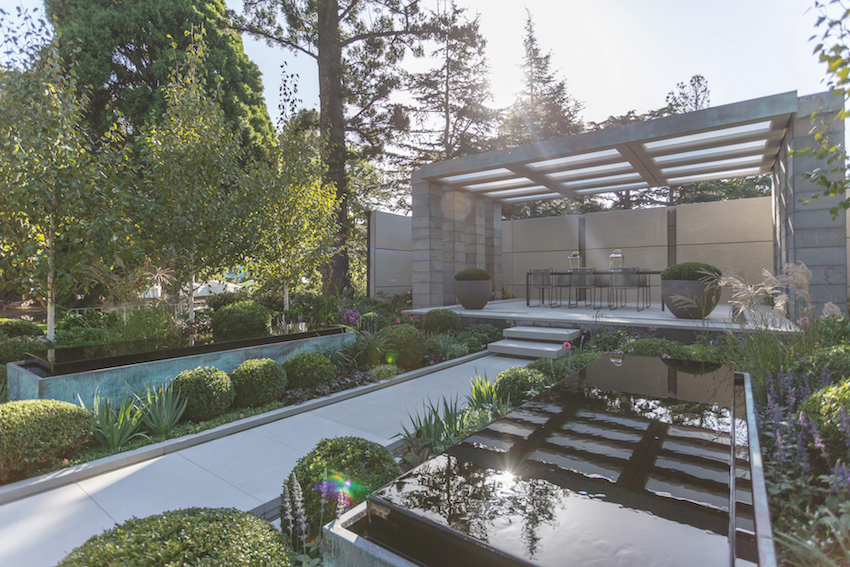 Ce jardin de Charlie Albone, baptisé « An Urban Sanctuary » (« un sanctuaire urbain »), s’appréhende comme un lieu de retraite, un abri construit au sein de la ville. L’espace est organisé autour d’une allée centrale composée de larges dalles de pierre menant à une pergola, refuge ouvert qui domine le lieu. On retrouve dans cette création du paysagiste australien une certaine symétrie, élément déjà présent dans des projets précédents. Deux bassins à débordement encadrent le passage où la surface de l’eau agit comme un miroir reflétant le jardin. Cette eau qui coule en permanence, sa surface réfléchissante, confèrent au lieu une sérénité et ajoutent de la profondeur à l’espace.