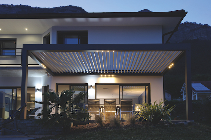 Pareillement que toute pièce de la maison, la pergola se doit d’être exploitable toute l’année. Elle est aujourd’hui, à coup sûr, bioclimatique, c’est-à-dire capable de répondre aux changements climatiques, et, qui plus est, quasi instantanément. La plupart comportent une toiture équipée de lames en aluminium, dont la position est gérée automatiquement par des capteurs (de vent, de pluie…), par télécommande, ou encore par smartphone. On les ferme pour assurer une étanchéité à l’eau et à l’air, on les entrouvre pour faciliter le renouvellement de l’air, on les oriente comme on le souhaite pour se protéger du soleil. Elles sont souvent associées à des stores verticaux, des toiles enroulantes ou coulissantes, eux aussi connectés. La domotique prend une part de plus en plus importante sur le marché, comme l’explique Stéphane Le Tallec, business development manager France de Renson : « La connectivité prendra une plus grande place, également dans les pergolas bioclimatiques. Orienter ou rétracter les lames en fonction des conditions climatiques, à distance ou de chez soi, allumer le chauffage et régler la densité de la lumière ou la musique depuis votre smartphone, ces fonctionnalités seront de plus en plus demandées par les consommateurs. »