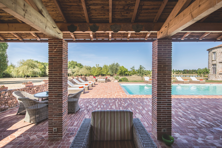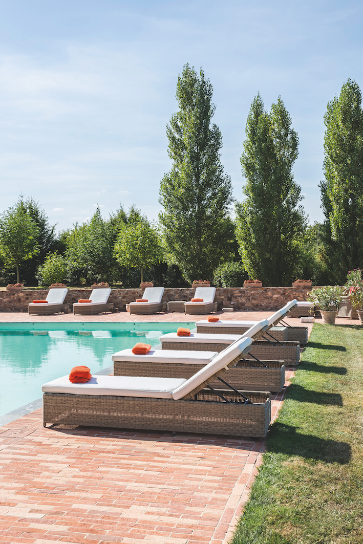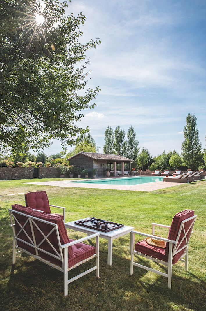 La terrasse assure cette dimension d’intégration historique grâce à un carrelage de tomettes aux coloris variant de l’ocre rouge à la terre de Sienne brune ou rosée pour un effet ancien et traditionnel. En terre cuite, douce et naturelle, de formes variées, ce matériau est le trait d’union entre les vieilles pierres du logis et l’esprit contemporain de la piscine. Sa résistance à l’usure est adaptée aux conditions climatiques rigoureuses, comme ses performances thermiques, qui apportent une inertie agréable en soirée d’automne. La forme des tomettes est travaillée différemment selon l’espace : des parefeuilles de forme rectangulaire marquent la terrasse de la piscine, des losanges et de plus petits rectangles délimitent la zone des salons et de la salle à manger. Leur pose est tout aussi originale et porteuse du sens lié à l’usage du lieu. Ainsi, la zone solarium est dessinée par des tomettes posées à bâtons rompus, c’est-à-dire disposées parallèlement entre elles par travées et assemblées en équerre, tel un parquet en bois. Autour du bassin, la margelle en marbre gris de Turquie souligne le rectangle d’eau et renvoie aux pierres des édifices. Des murets ont également été construits autour de l’espace piscine dans l’esprit du lieu et pour le délimiter sur cet immense terrain qui possède aussi un étang.