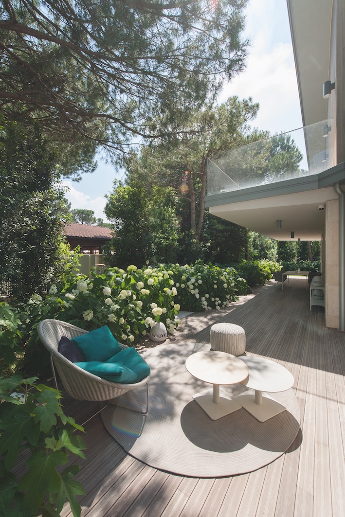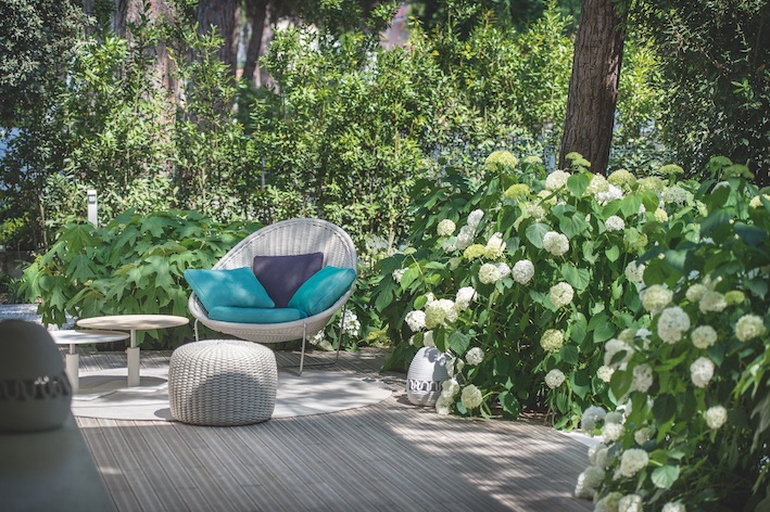 Le caractère vert du lieu semble d’ailleurs avoir été une priorité de Frassinago, puisque les plantes choisies possèdent des feuilles persistantes. Quelle que soit la période de l’année, l’aspect végétal du lieu est conservé et permet de préserver son calme, sa sérénité, ainsi qu’un ombrage bienvenu au cœur de l’été. Cette idée générale est d’ailleurs renforcée à travers le choix de matériaux et de fleurs qui s’harmonisent avec la couleur de la villa. Le sol en teck, les sièges en corde tressée sont, comme les murs, de teinte beige, crème. Les fleurs sont des hortensias blancs, dont le coloris se fond aussi parfaitement avec le reste. Cette harmonie de couleurs claires concourt donc à procurer au visiteur une sensation d’apaisement et ajoute de la lumière à cet havre bucolique et cosy.