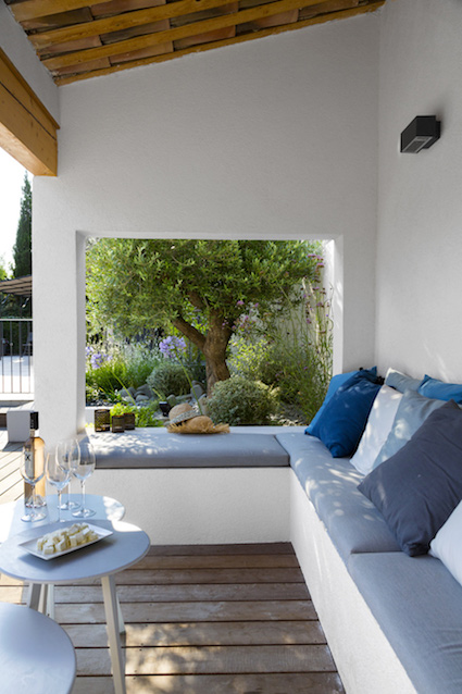 Chez Moingeon et Morvant, c’est un muret face à la maison, qui accueille une pause à l’ombre, ou, près de la piscine, un petit espace protégé qui reçoit une banquette pour des instants conviviaux plus intimes. Certains jouent sur la couleur, l’originalité, avec des tables en aluminium qui intègrent une fontaine et donnent un cadre apaisant tout  en étant unique.
