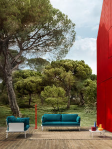 Aux lignes fluides et aux dimensions généreuses, la collection Reva évoque avant tout la détente. Ici, les canapés sont habilement entourés de la lampe d’extérieur sans fil de Basaglia Rota Nodari, Giravolta.  À côtéla petite table Buddy se détache sobrement sur le mur rouge de la maison.