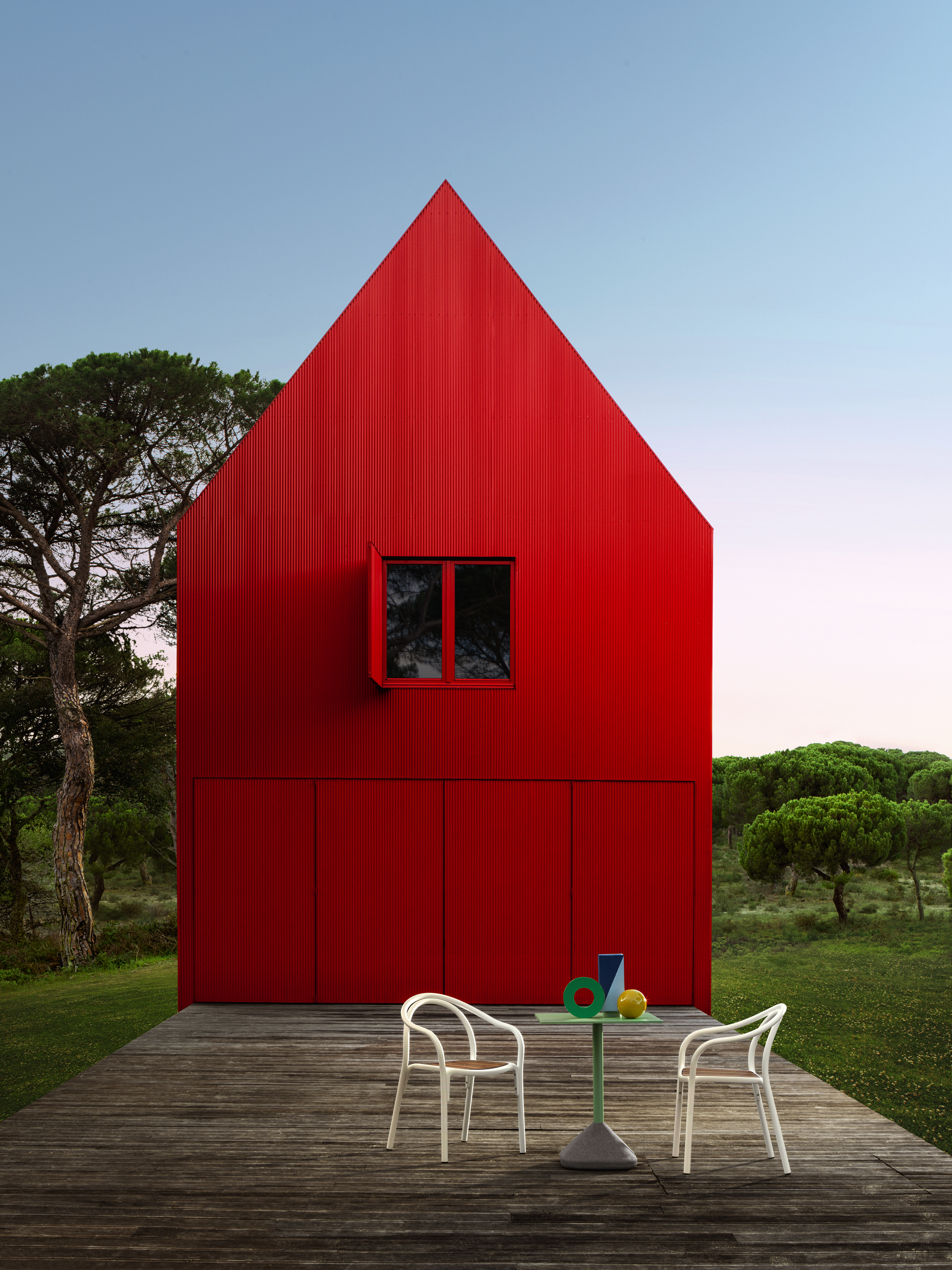 Localisé dans la région portugaise d’Alentejo, la Casa 3000, réalisé par l’agence Rebelo de Andrade, s’étend sur 500 hectares, comme une touche de couleur qui se détache dans le vert environnant. C’est ici que Pedrali a choisi de mettre en scène ses derniers produits :  Cet exercice de style,  est ainisi l’occasion de revenir sur les différentes collaborations de l ‘éditeur italien avec les designers : la collection Tribeca avec CMP Design, les sofas Reva de Patrick Jouin , les collections Soul et Remind d’Eugeni Quitllet,  , les lampes Giravolta dans différentes déclinaisons…   Une occasion aussi d’imaginer une mise en situation originale des produits,  par la puissance du décor contrasté entre une maison rouge et un cadre végétal fort, et une valorisation des lignes élégantes des assises.