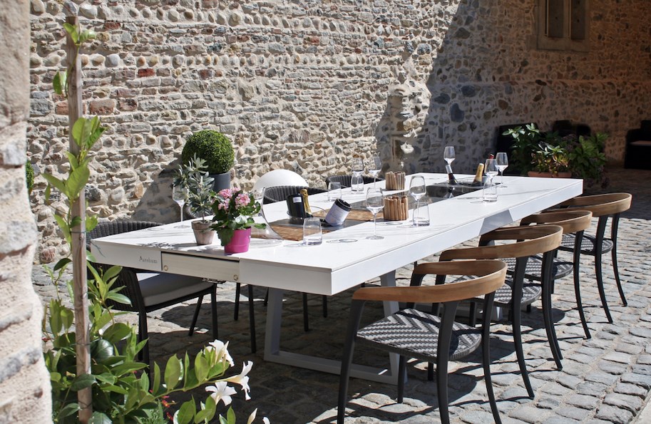 Dans une autre approche du brasero, des planchas nomades ou des barbecues, Aurehum propose des tables extérieurs qui incluent des éléments de cuisine , dans un format mange-debout ou autour de laquelle s’asseoir. Ses propositions se déclinent autour de trois gammes :