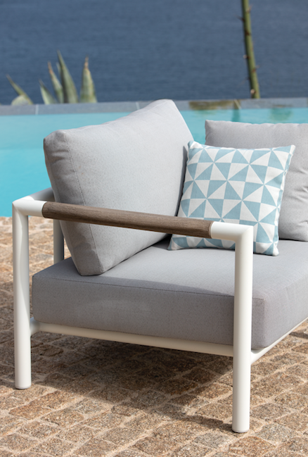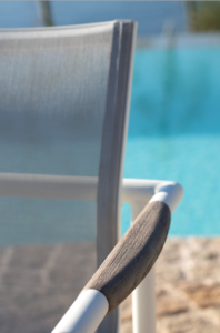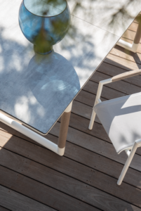 En associant l’aluminium au teck pour les structures des assises et le piétement des tables, en choisissant le HPL béton ciré pour le plateau de ces dernières, Les Jardins misent sur des matériaux nobles et solides, à l’épreuve des intempéries. Tout en restant dans la tendance de mixage de matériaux, un positionnement esthétique que l’on a vu se développer ces dernières années dans le mobilier outdoor et qui fait partie de l’ADN du fabricant français.