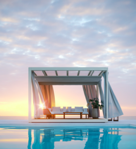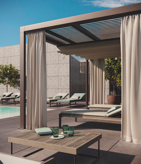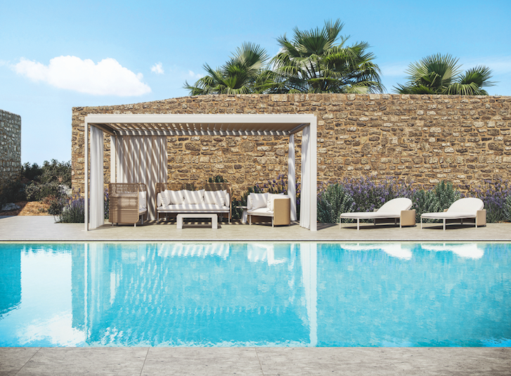 Ethimo a fait appel au duo Ludovica + Roberto Palomba pour concevoir sa nouvelle pergola. Eivissa est une structure d’habitat,  qui propose un  espace protégé du soleil, du vent, et de la pluie. Véritable pièce à ciel ouvert, chaque construction est imaginée sur mesure, par le choix des couleurs, revêtements, planchers, et accessoires qui la composent.