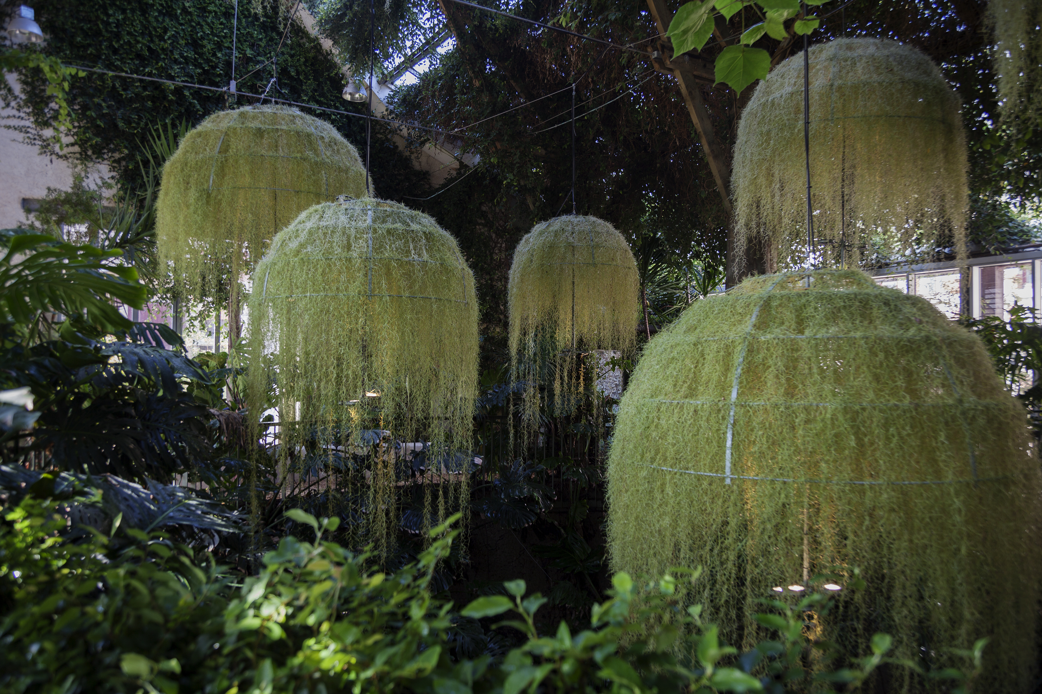 C’est au-dessus de ce puits que Patrick Nadeau a installé “Rainforest”. “Conçue comme un collage de paysages plus ou moins imaginaires, [l’installation] apparaît comme une pluie traversant une forêt tropicale pour tomber sur de grandes flaques bleu turquoise” explique le designer. Cette pluie est constituée de Tillandsias usnéoides, plus communément appelée “mousse espagnole”, typique des lacs et marais de tourbe du sud des États-Unis. Ces plantes épiphytes vivent accrochées aux branches des arbres, voire même suspendues aux câbles électriques, en se nourrissant exclusivement de l’humidité de l’air. Les Tillandsias sont disposées sur des “structures filaires en demi-sphères composant des sortes de crinolines mi-organiques mi-architecturales”, leur donnant l’aspect de guirlandes lumineuses en lévitation. En effet, leur couleur vert de gris avec des reflets argentés reflète le moindre rayon de lumière qui traverse l’épaisse couche d’aristocholes géantes sur la verrière.