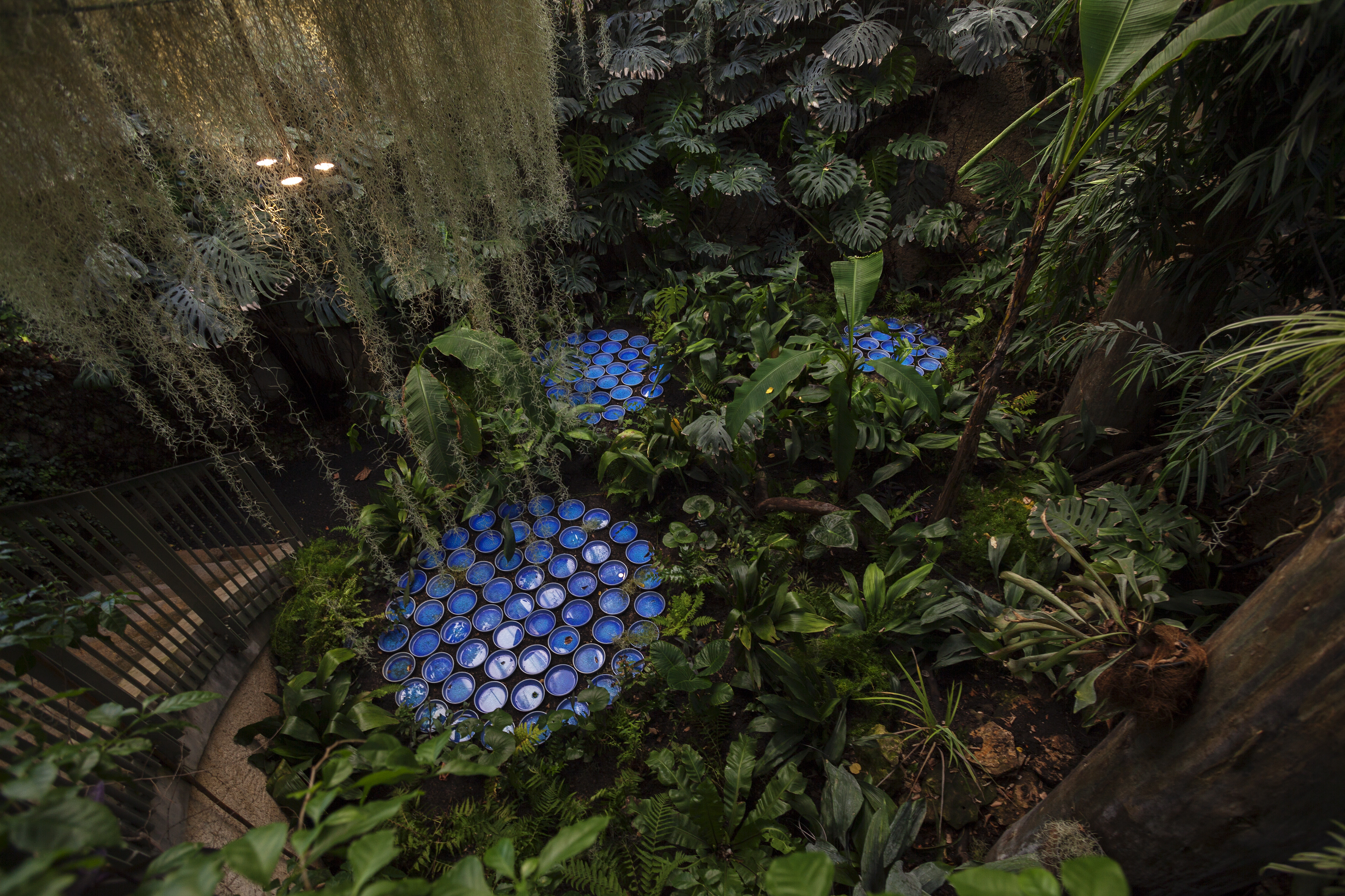Cet ornement végétal pointe naturellement vers le fond du puits où l’on retrouve un paysage réputé du Yucatán : les cénotes. Ces trous d’eau bleu azur ouverts sur des galeries souterraines abritent des réserves d’eau douce. Dans l’installation, elles sont représentées, tapies dans les Monstéra, par “des coupelles en céramique dans lesquelles du verre fondu bleu apporte un effet aquatique” qui s’illuminent au moindre rayon de soleil.